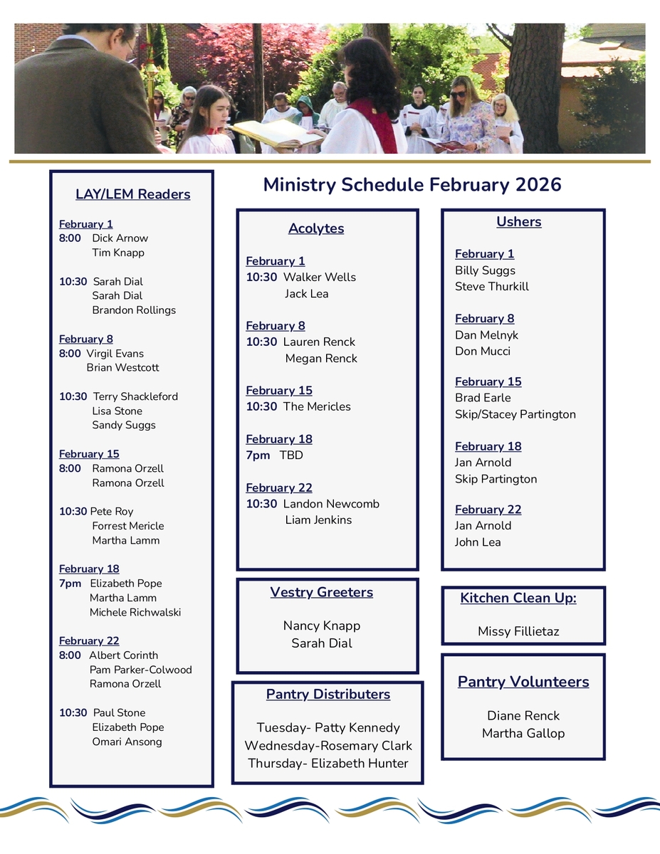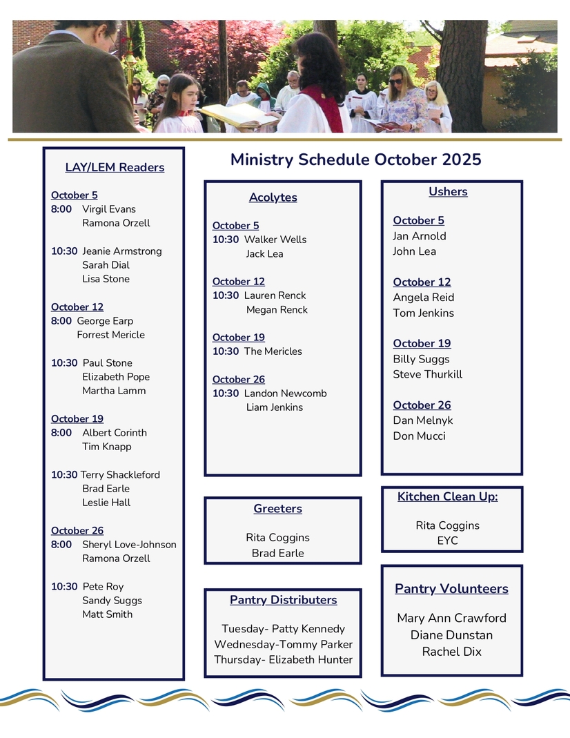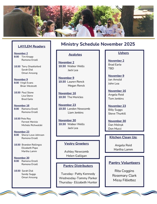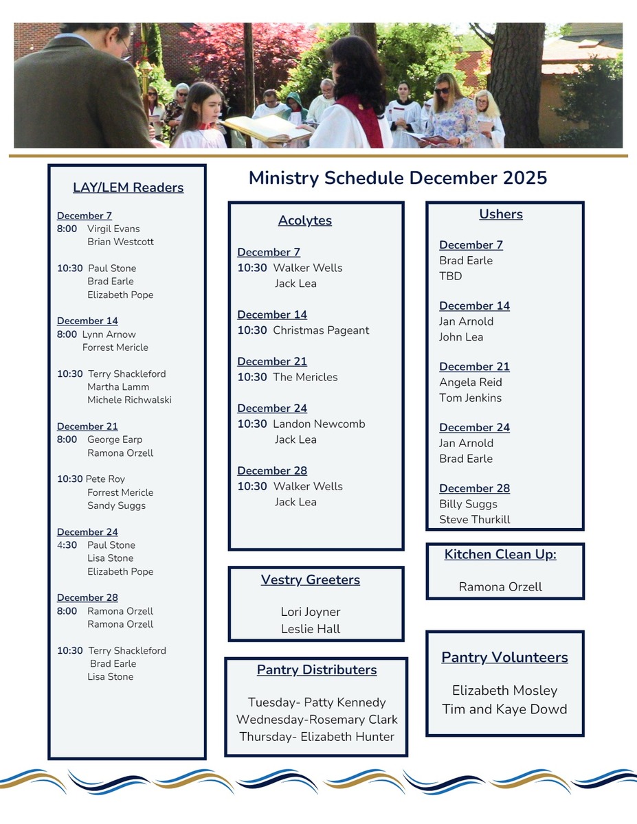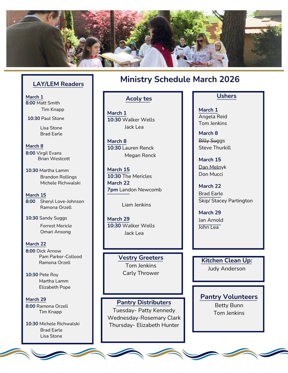 Serving others is a key part of our faith journey. Below is the monthly schedule for our various ministries. Your willingness to serve makes a huge difference in our church community and beyond. Thank you for your dedication!